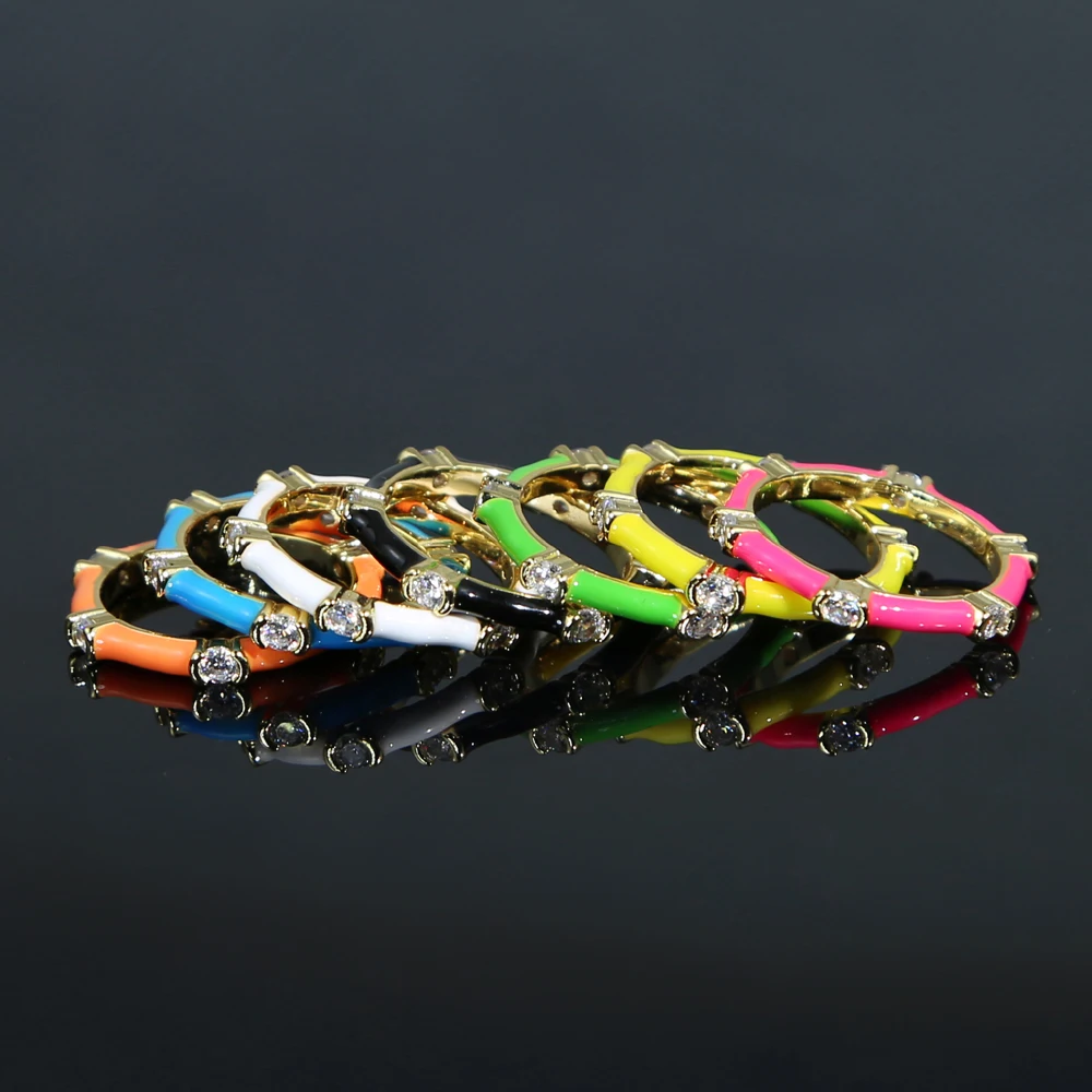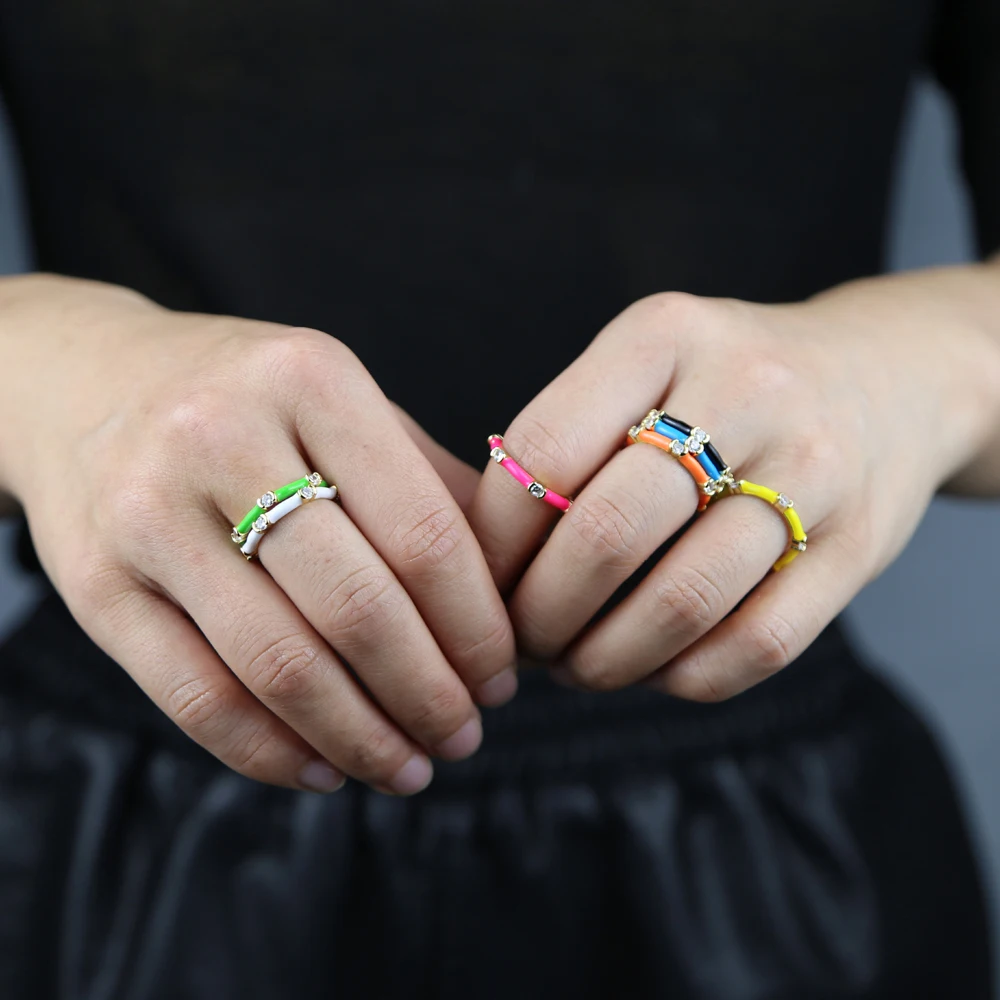 Add a splash of color with this Colorful Enamel Neon CZ Band Ring. Gold-plated and studded with vibrant cubic zirconia, it’s stackable, fun, and perfect for casual or party outfits. Lightweight and adjustable for most fingers.